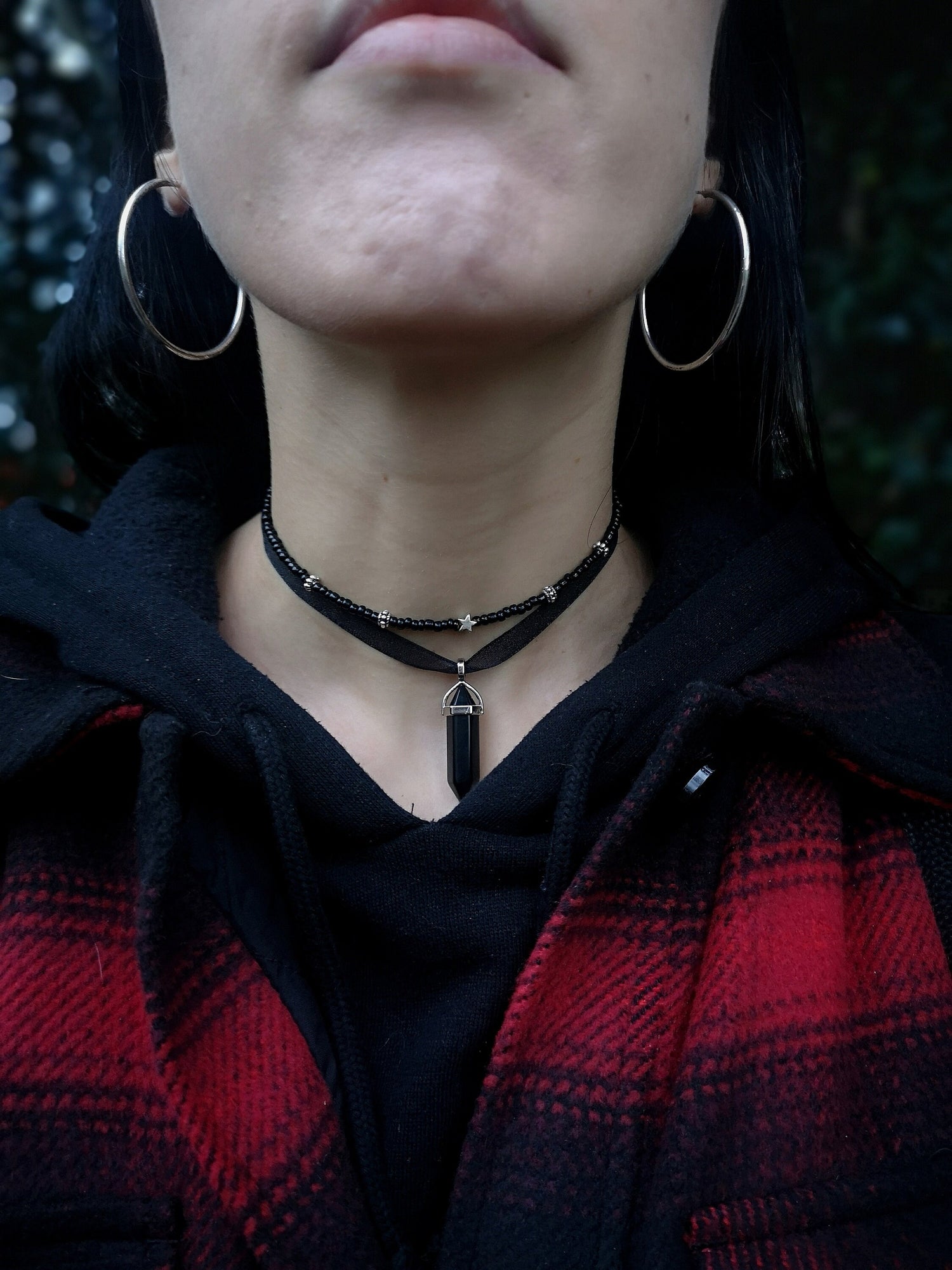 These two tier choker necklaces are available with two pendant options, black agate or white agate.