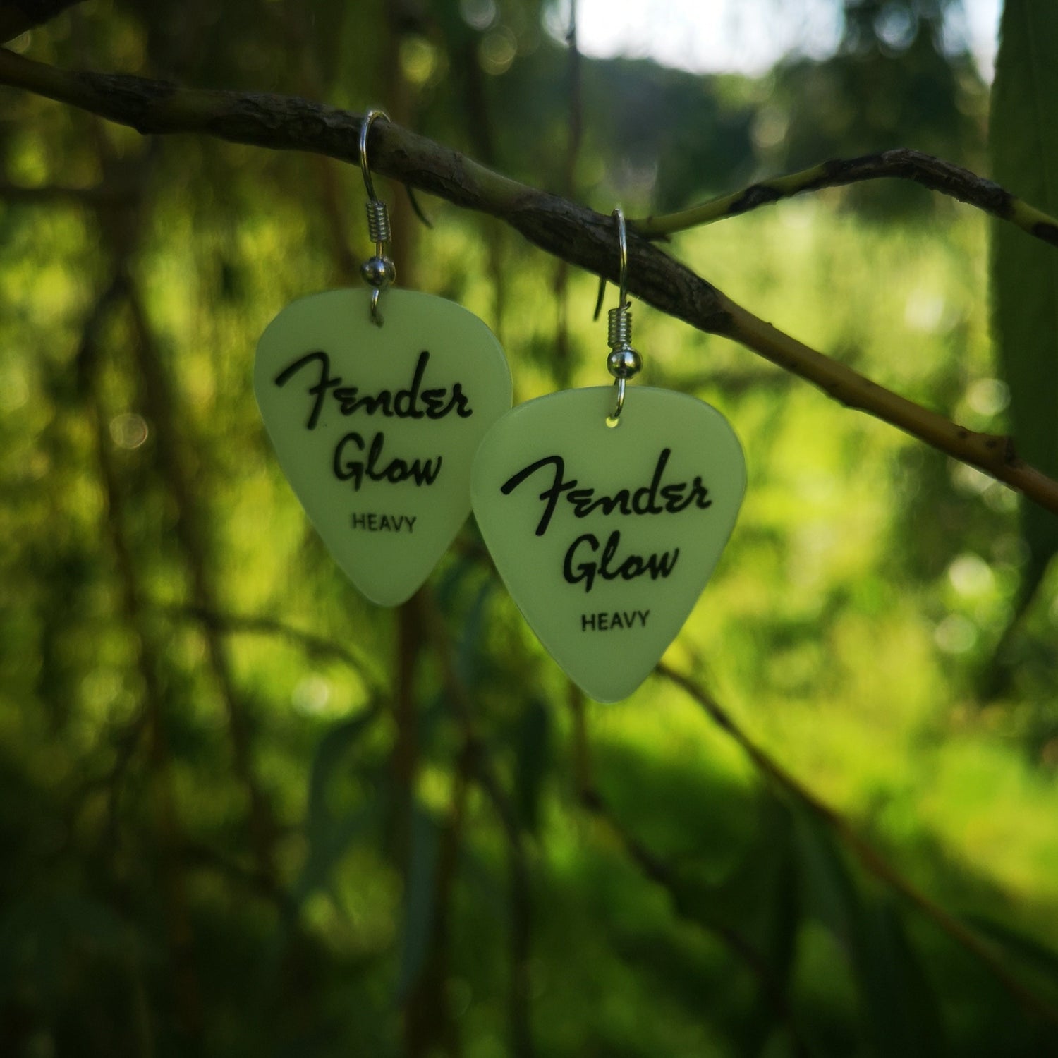 Earrings made with a glow in the dark Fender Heavy plectrum.