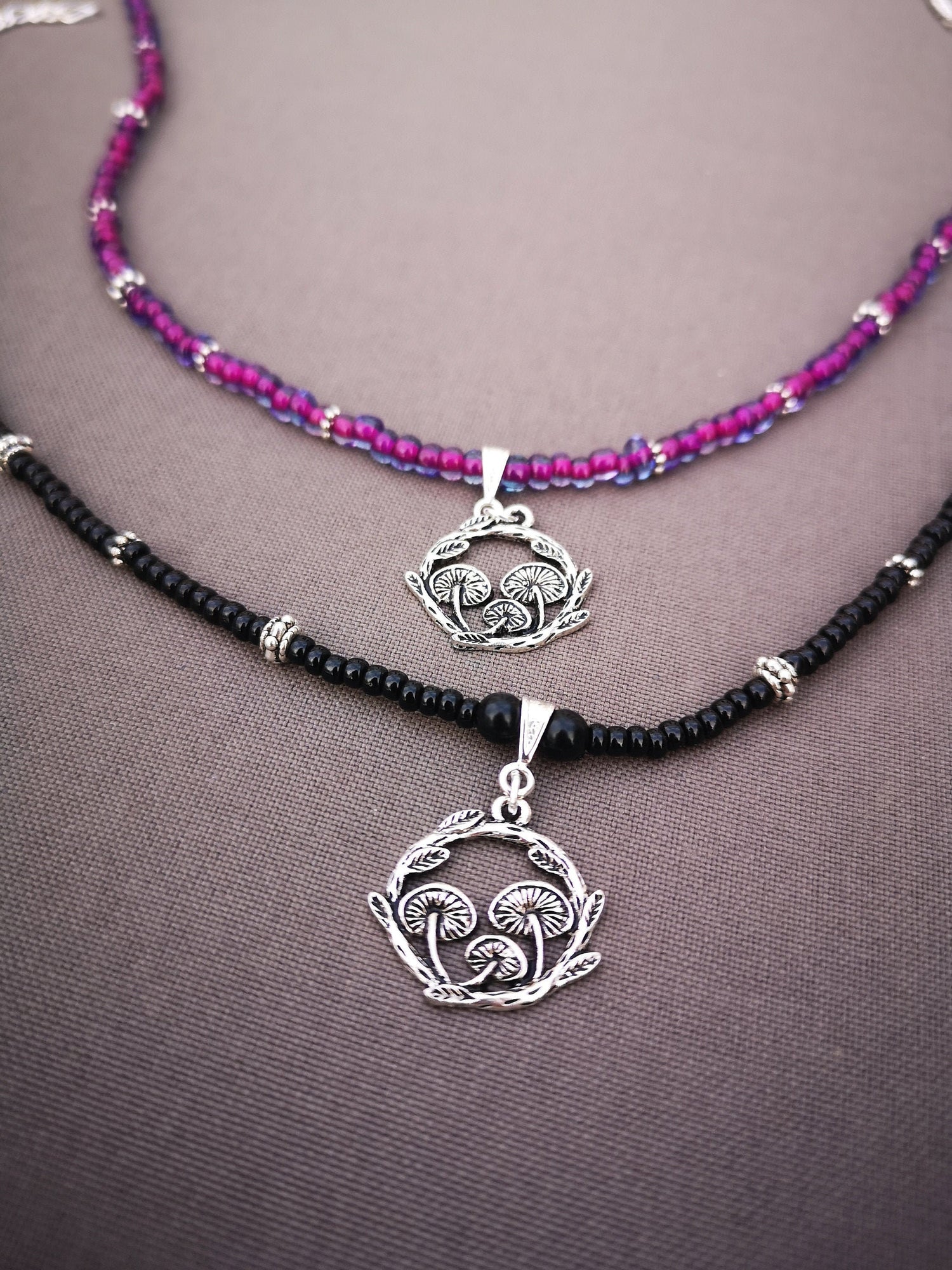 Single strand necklace with beautiful mushroom charm and silver feature beads, with options of black or purple/pink to chose from.