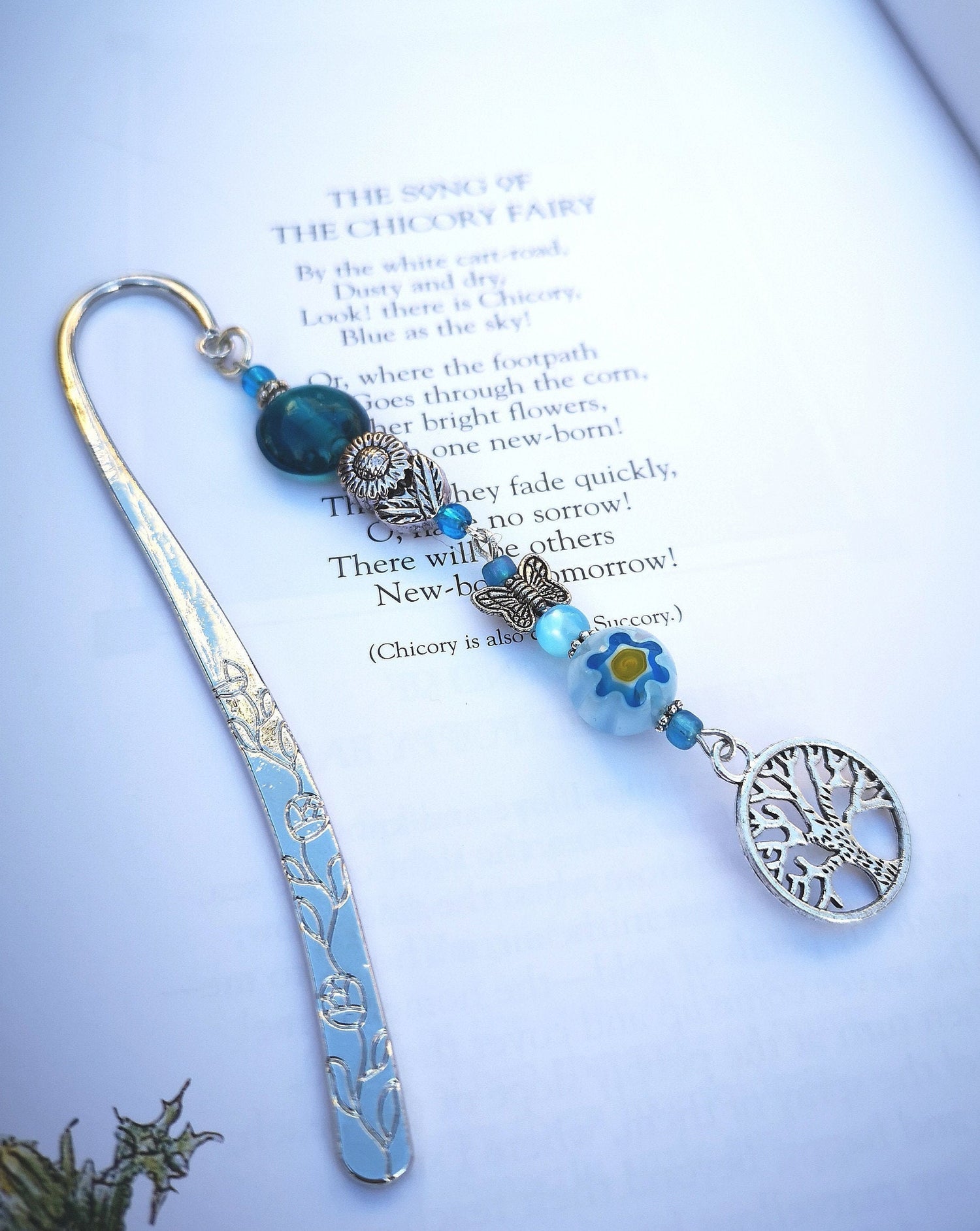 Handmade one-off bookmark with Silver plated Tree of Life charm, Silver detail beads including a flower and a butterfly and blue glass beads.