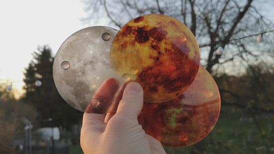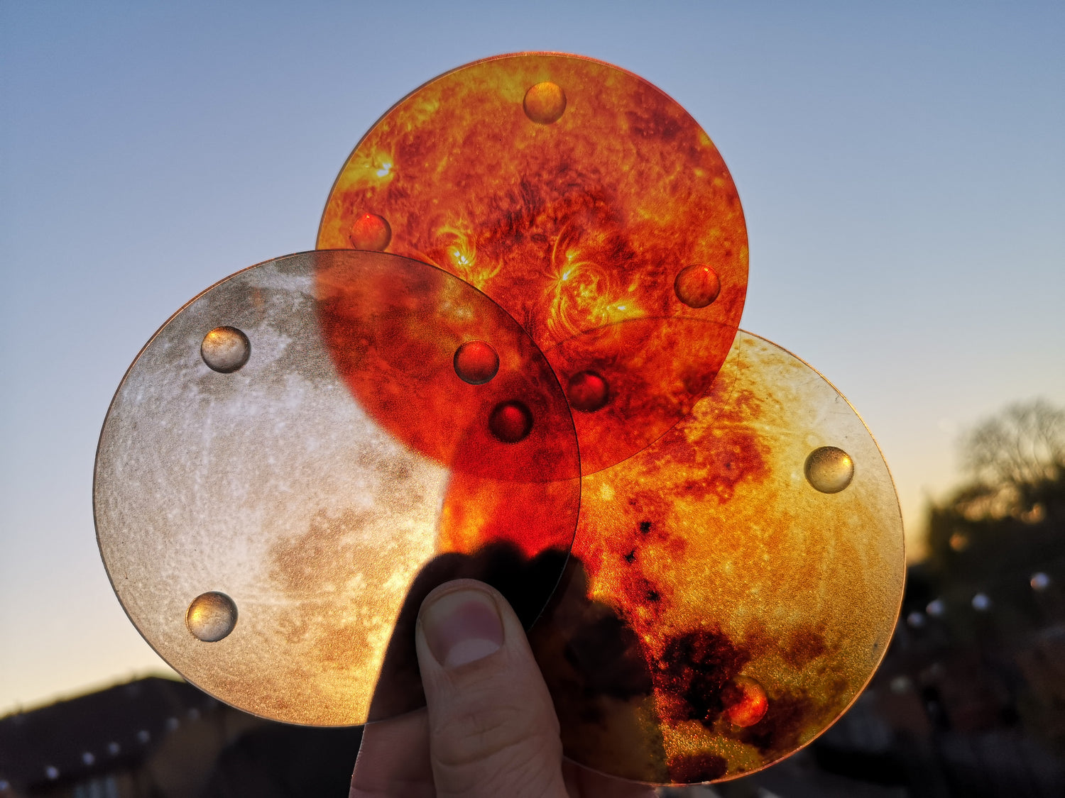One set contains x2 Sun, x2 Grey moon and x2 Red Moon Coasters.